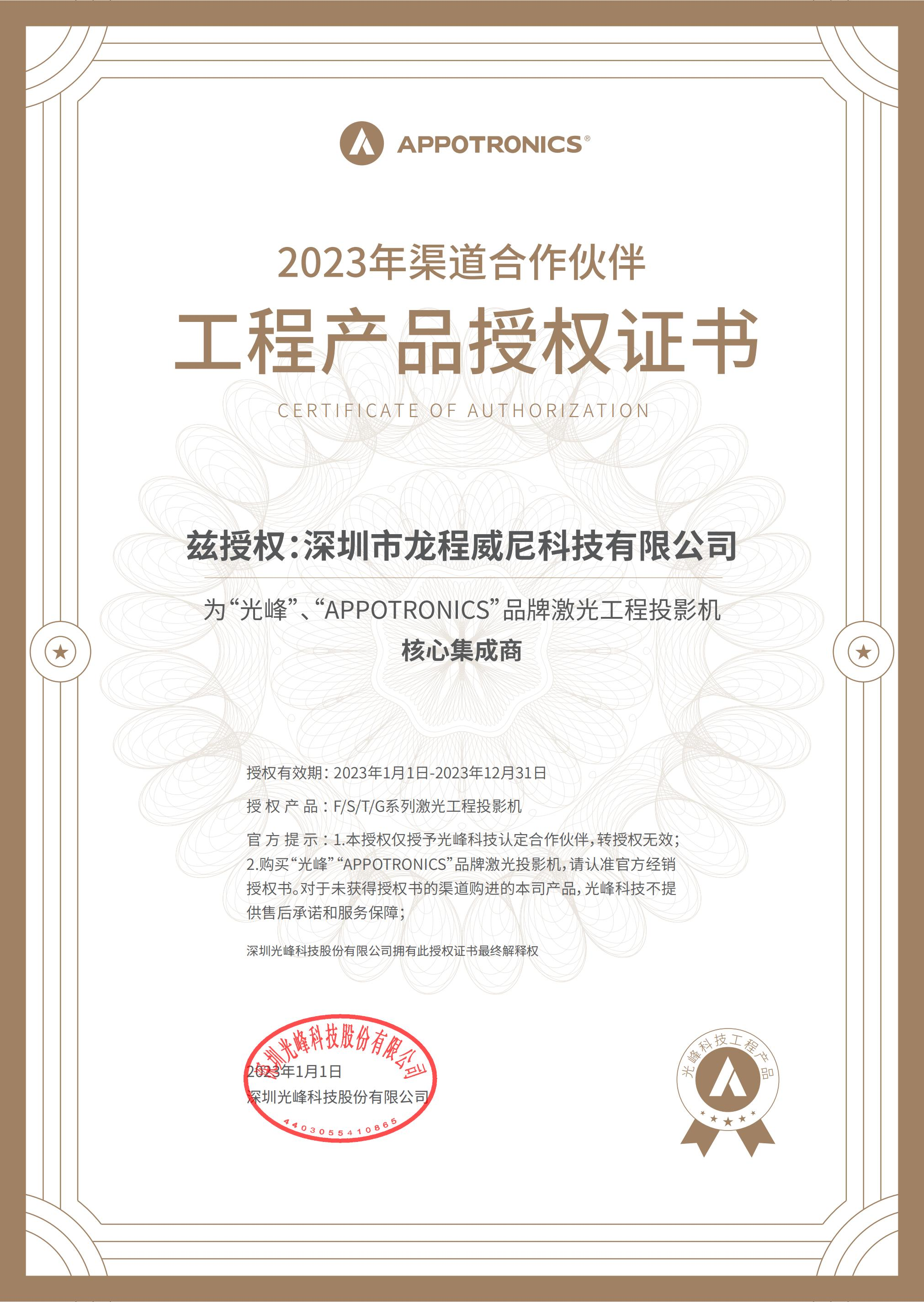 公司被授權(quán)為“光峰”投影機經(jīng)銷商
